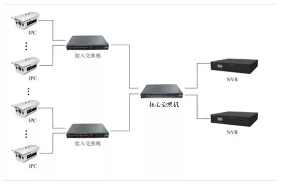 如采用200萬(wàn)像素IPC,碼流以4Mbps計(jì)算,100臺(tái)攝像機(jī)占用帶寬為4M*100=400M,如果是按照10臺(tái)攝像機(jī)接入百兆交換機(jī)的話,那么我們需要10臺(tái)接入層交換機(jī),那么核心層交換機(jī)需要三層全千兆交換機(jī)。